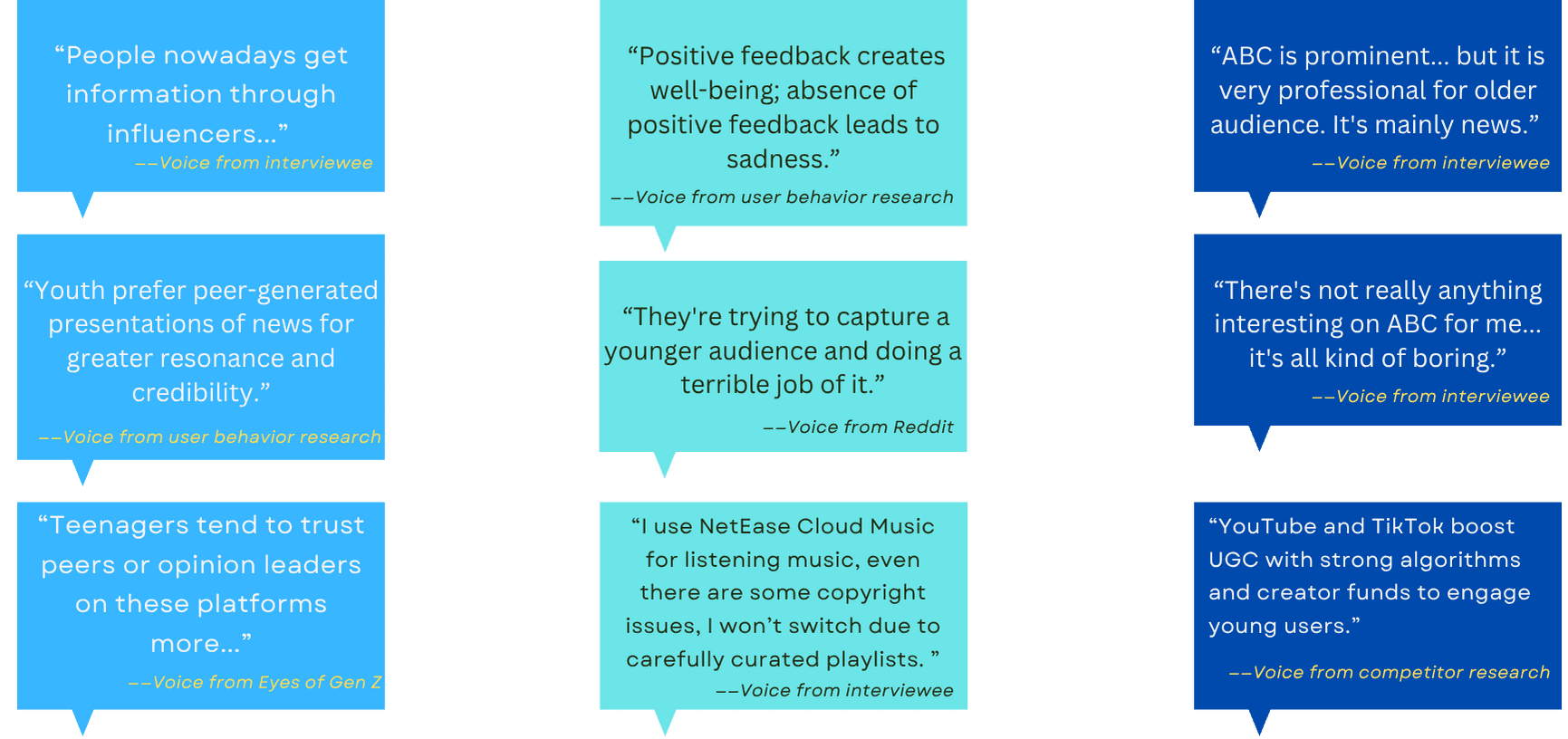 We then conducted in-depth User Interviews to explore how target users perceive ABC and what they expect from media content.