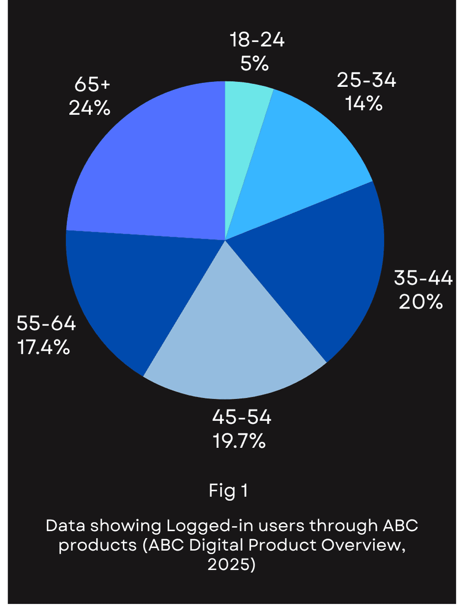ABC has long been one of the most broadly consumed news sources in Australia, however, young people show little interest in it. Research shows that users aged 18 to 24 make up the smallest proportion of ABC’s overall audience (Fig 1). This indicates that ABC’s brand image is gradually losing its appeal among younger generations. In terms of content structure, platform interaction, and visual expression, ABC has yet to meet the deeper needs of young people for personalization, a sense of participation, and cultural identity.