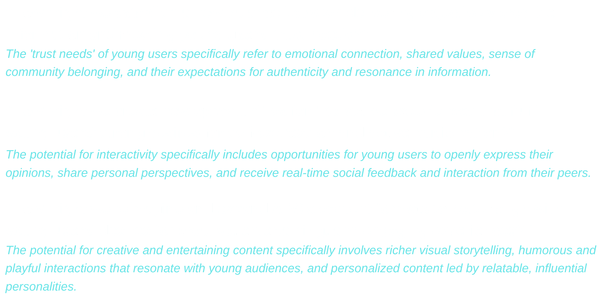 If ABC leverages these gaps, it can build a new brand experience that combines credibility with emotional relevance. This would differentiate ABC from both purely entertainment platforms (e.g., Netflix, TikTok, YouTube) and traditional news outlets, creating a more engaging, trustworthy, and youth-aligned identity that better attracts and sustains young users’ attention.