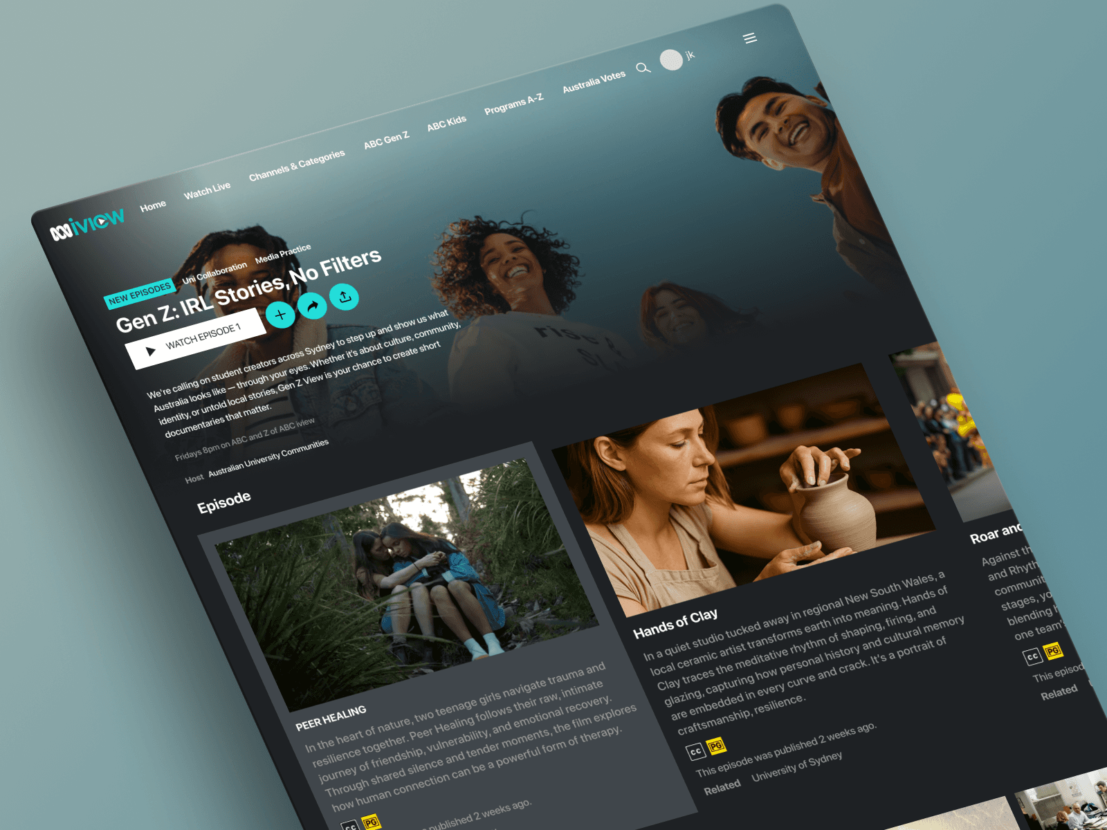 This project reimagines ABC iView to engage Gen Z through authentic, interactive, and community-driven experiences. By introducing a curated Gen Z channel and a student-led Documentary Week, the redesign fosters trust, creativity, and cultural connection.
