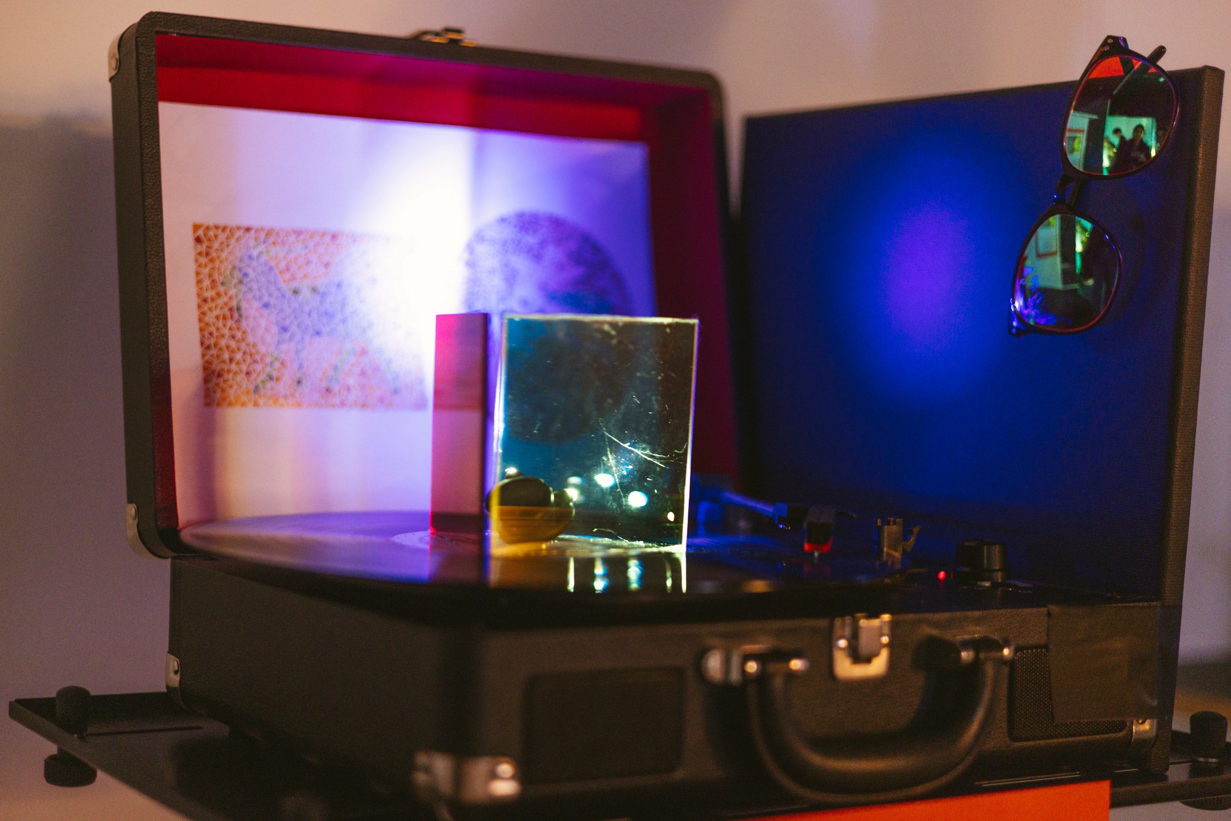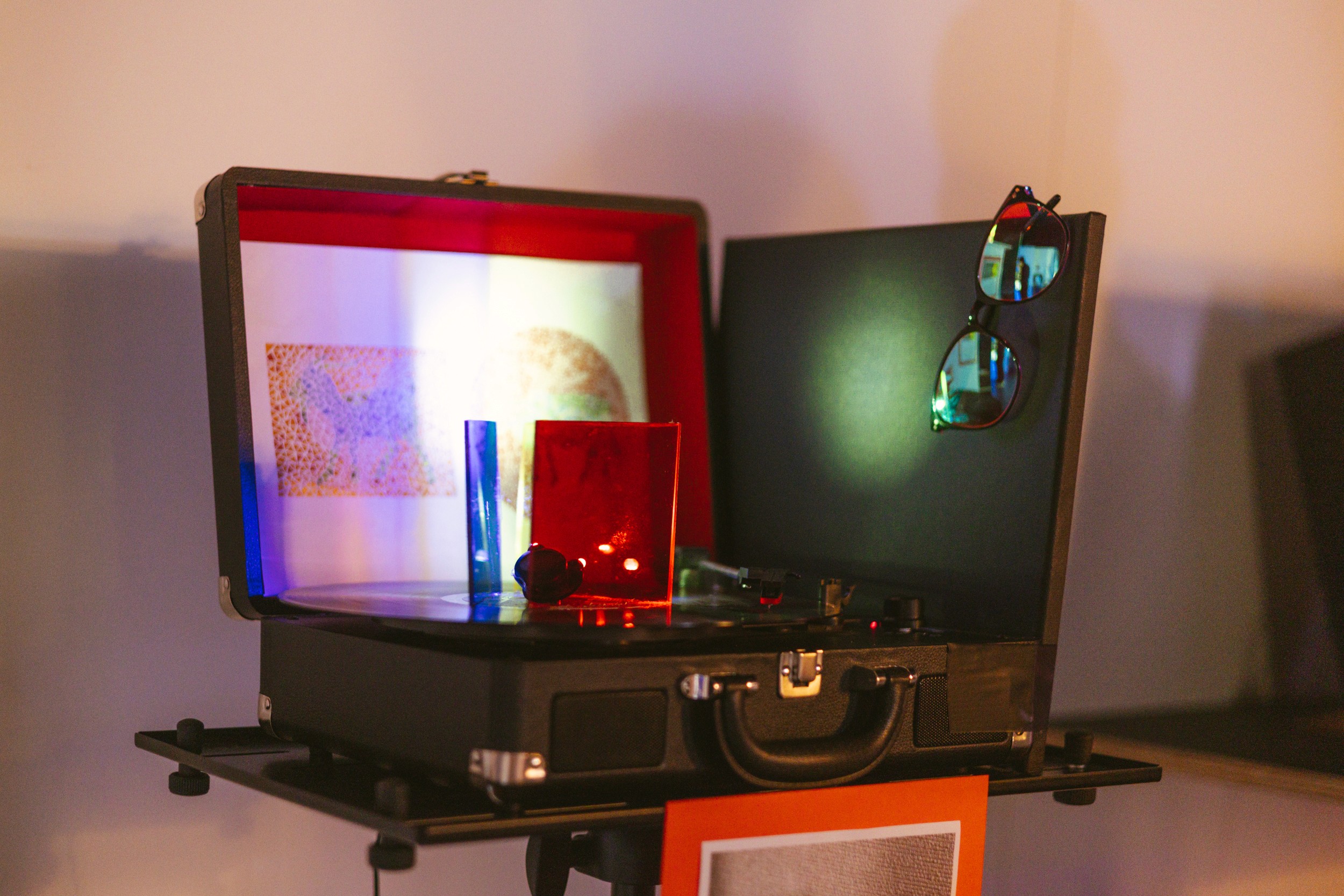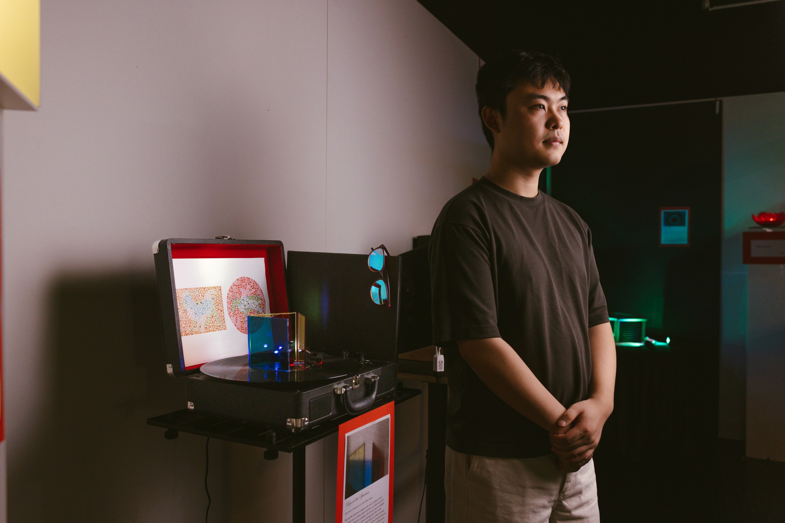 Beyond the Spectrum reimagines the classic Ishihara colour-blindness test as a kinetic light experience. Red, blue, and yellow filters are mounted on a spinning vinyl record; as a spotlight moves with the rotation, it passes through each filter in turn, alternately revealing different animal forms on a dotted test plate.